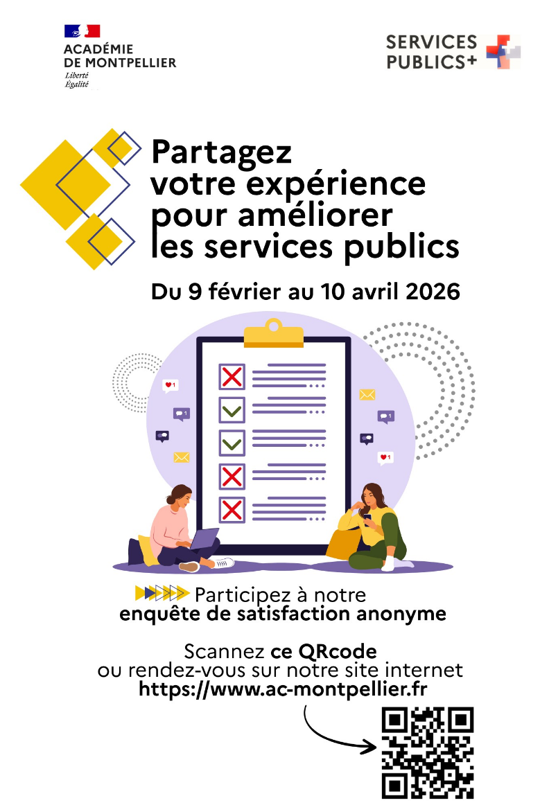 Vous êtes élève, étudiant, parent ou personnel de l’éducation nationale ? Donnez votre avis ! L'académie de Montpellier renouvelle son enquête annuelle de satisfaction ! 🕒 Moins de 2 minutes ! 🗓️ Du 9 fév